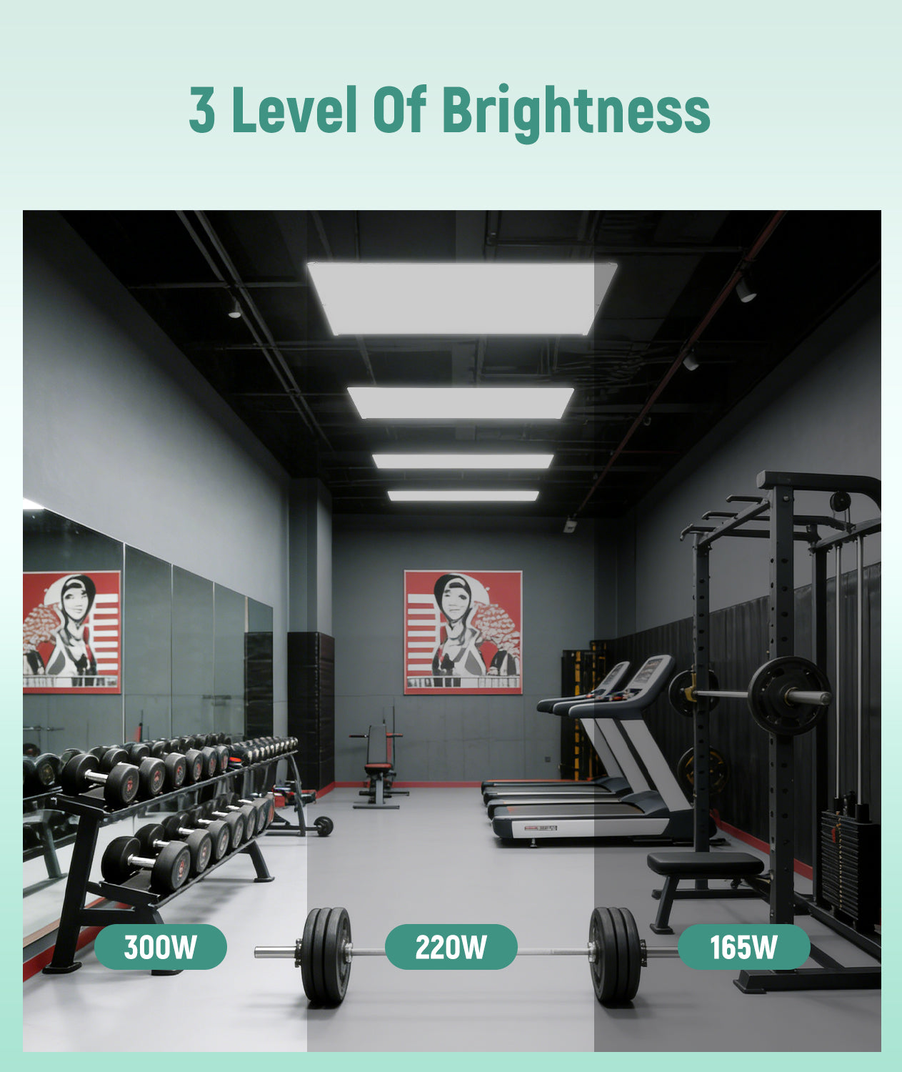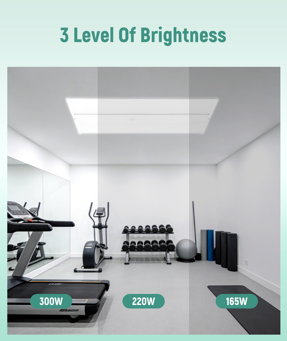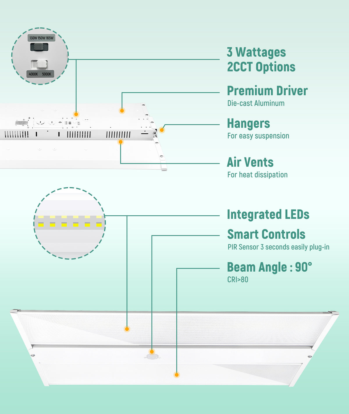 The fixture supports 165W / 150W / 130W selectable power, allowing installers to adjust brightness according to ceiling height and lighting requirements.