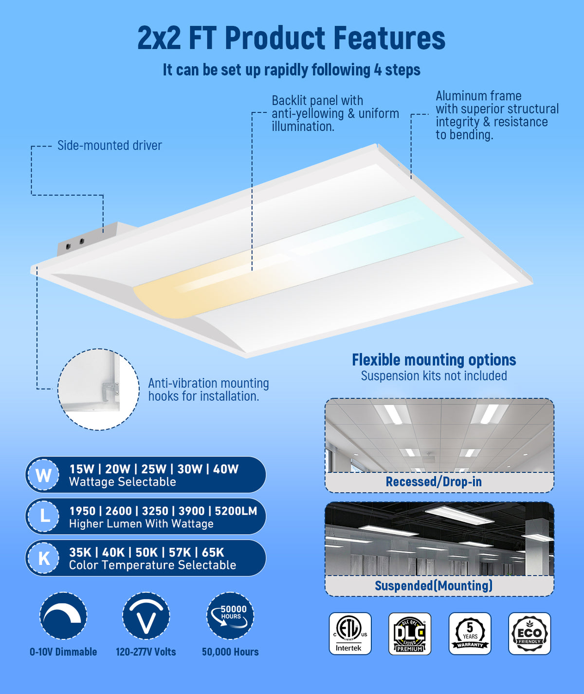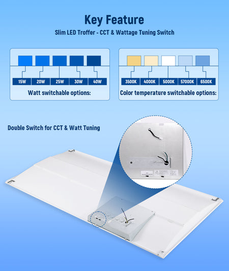 | Mount type | "Easy installation in new construction or retrofit Standard recessed mounting in most 2’ x 2’ or 2’ x 4’ grid ceilings Earthquake clips included Easily set wattage and CCT during installation using the adjustment switches located on the driver box" |